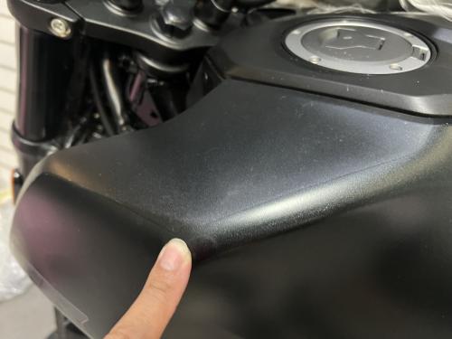 可能是摩托車線條複雜,所以犀牛皮沒有賣整塊的,光是油箱就拆成了左右上方,左右側面,左右下方共6塊,這樣買下來隨便都要破三千,以CP來算實在是不高。幸好版型算準確,雖然不是滿版仍有留3mm左右的邊角沒貼到,但用料是好的稍微彌補了遺憾,貼犀牛皮最忌諱的就是心急遇到邊角要善用材料的特性平坦處拉伸在邊角不要拉過頭避免擠料突出,這種東西只能多練習,還有多噴肥皂水,避免太快黏住導致犀牛皮受力不均。 原廠烤漆是消光墨綠,所以也選擇了霧面犀牛皮,但貼上去後的光澤與原廠漆多少有色差。犀牛皮拼接的邊角&情況如照片參考,原廠貼紙有一定的厚度所以犀牛皮貼上後多少有空隙,可以接受的話可以買來貼看看。
