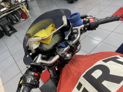 ※之所以會想把手換掉,主因是去年騎著SV去跑武荖坑林道,倒車歪了,次要原因是自己想要增加車頭的荷重,並且調整成更前傾、內縮的騎姿。但為了避免周邊零件(油門線、離合器線...) 都要跟著調整,我在選擇上很苦惱。最後是看中這組把手的寬、高度跟原廠沒有差距太大,也上網作功課獲得了國外車友的反饋,然後才下手。